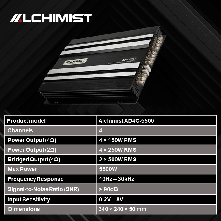 The Alchimist AD4C-5500 is a high-performance 4-channel car amplifier designed for premium in-car audio systems. Built to deliver powerful output, clean sound reproduction, and flexible system configuration, it is ideal for driving full-range speakers as well as subwoofer setups.